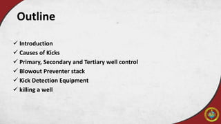 This document provides an overview of well control procedures. It discusses causes of kicks such as swabbing or pumping light mud that can lead to underbalance. Primary well control relies on mud hydrostatic pressure, while secondary control uses a blowout preventer. Tertiary control involves pumping substances to stop downhole flow. Methods for killing a well are also presented, including the driller's method, wait and weight, volumetric, and bullheading. Kick detection equipment like the pit volume totalizer and flow indicator are also outlined.