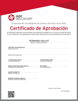 This document provides details on Fernando Salvats' well servicing workover from December 12, 2019 to December 12, 2021. It lists his identification number 00173452 and phone number 54-297-4445716. The document also includes Marcelo Andres Lagreze's identification number 37171372-425205 and their employer as Well Control International S.A.