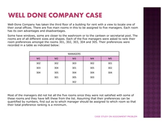 Managers were asked to rank their preferences for 5 rooms (301, 302, 303, 304, 305). Using the Hungarian method, the rooms were assigned to minimize total preference ranking. The method involved subtracting minimums, assigning singles, crossing zeros, and iterating until all rows/columns had a zero. The optimal assignment was: M1 to room 302, M2 to room 304, M3 to room 303, M4 to room 305, and M5 to room 301. This yielded a minimum total ranking of 7.