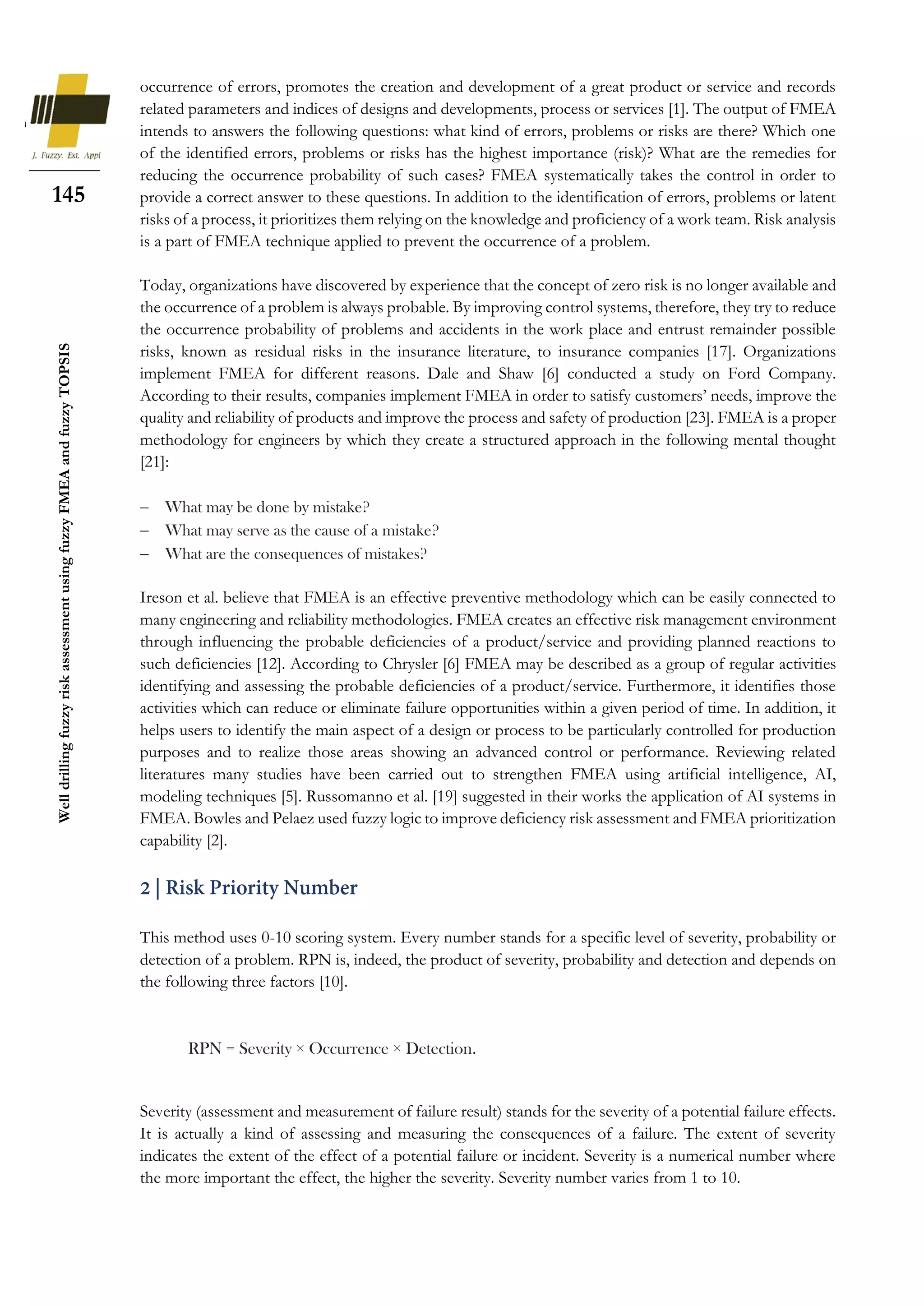 The document discusses the implementation of fuzzy Failure Mode and Effects Analysis (FMEA) and fuzzy Technique for Order of Preference by Similarity to Ideal Solution (TOPSIS) for risk assessment in well drilling. It emphasizes the importance of identifying and prioritizing error and risk factors using a fuzzy logic-based approach to enhance decision-making and reduce potential failures. A case study is included to illustrate the application of these methodologies in assessing risks and improving reliability and safety in engineering processes.