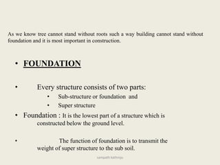 The document discusses different types of well foundations used in construction. It describes the key components of well foundations including the cutting edge, steining, bottom plug, top plug, and well cap. It explains the process of sinking well foundations, which involves excavating material inside the well curb to allow the well to sink vertically into the ground. Precautions like maintaining verticality and limiting tilt and shift are important during well sinking.