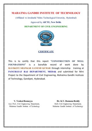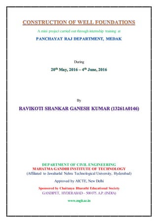This document discusses different types of well foundations used in construction. It describes three main types: open caissons, which have open tops and bottoms; pneumatic caissons, which use air pressure; and box caissons, which are closed at the bottom. It provides details on each type, including advantages and disadvantages. Open caissons can be built to greater depths but inspection of the bottom is not possible. Pneumatic caissons allow work under water but require complex machinery. Box caissons have a lower construction cost but the foundation base cannot be inspected.