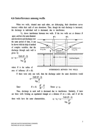 The document discusses specific capacity, which is a measure of well productivity calculated by dividing pumping rate by drawdown. It provides key information about specific capacity, including that it can be used to identify potential well problems, estimate aquifer transmissivity, and determine maximum pumping rates. The document also outlines best practices for specific capacity testing, such as pumping for at least 24 hours and performing semi-annual tests to monitor changes over time. Rehabilitation is recommended when specific capacity drops by 25% from initial values.