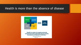 The document discusses the 2019 annual report from America's Health Rankings by the United Health Foundation. It emphasizes that health extends beyond just the absence of disease and outlines core measures impacting health for seniors, women, and children. The report also references specific health metrics relevant to Texas.