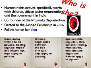 Margaret Wellman is a human rights activist who co-founded the Prajwala Organization in India. She works to increase government awareness of sex trafficking, rehabilitate rescued children, and create rescue policies through collaboration between citizen groups and the government. Some of her strategies include creating transit homes and lobbying for a comprehensive rescue policy. She has rehabilitated over 3,800 girls and helped over 5,000 children through a school for children of sex workers. However, making progress at the local level is not enough and she still faces challenges like violence and threats.