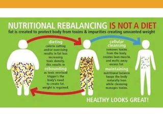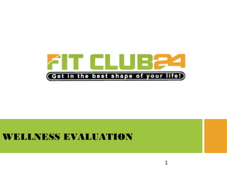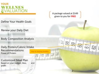 This document provides information about a wellness evaluation and customized meal plan program. It includes analyzing body composition, daily caloric and protein intake needs, and recommendations. The program then provides meal plans, supplement products like shakes and vitamins, and community support through fitness classes to help users meet their health and fitness goals.