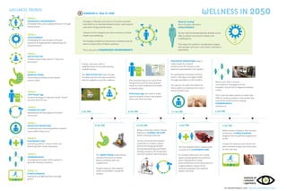 The document describes life in a futuristic society in 2050, focusing on the daily routine of Dr. Huang, who utilizes advanced technology for health and wellness. Key themes include engineered environments promoting holistic health, genetic enhancements enabling complex surgeries, and the integration of technology in personal and medical practices. It also outlines various wellness trends such as predictive prevention, customized care, and gamified fitness.