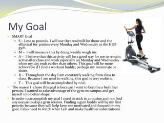 Erika's goal was to lose 10 pounds by November 16th by exercising at the gym for 1 hour on Mondays and 30 minutes on Wednesdays and doing weekly weigh-ins. Her barriers included finding time between classes, work, and homework and the cost of healthy food. Having a workout buddy would help her stay motivated. Over 9 weeks she lost 8 pounds through her gym routine and healthier eating, coming close to reaching her goal. She learned that exercise and diet make her feel better and that specific, time-bound goals keep her motivated.