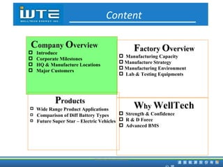 WellTech Energy is a leading energy storage company that has been in operation for over 30 years. It focuses on research, development and manufacturing of innovative energy modules. The company has factories and R&D centers in Taiwan and China with a total manufacturing capacity of over 20,000 units per month. WellTech provides high quality products and services to major customers in consumer electronics and electric vehicles.