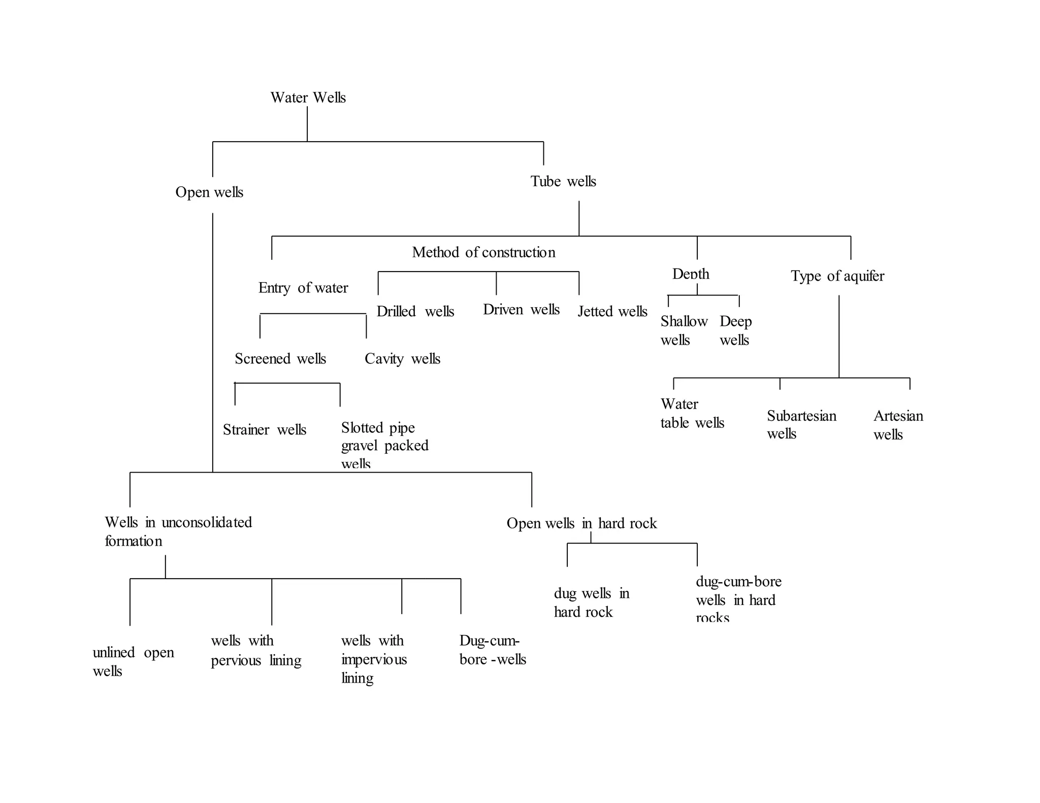 This document discusses different types of water wells, including tube wells, cavity wells, screened wells, slotted pipe wells, gravel packed wells, drilled wells, driven wells, and jetted wells. It also covers well depths from shallow to deep, types of aquifers like water table, subartesian, and artesian. Finally, it mentions open wells in unconsolidated formations, open wells in hard rock, and lined versus unlined open wells as well as dug-cum-bore wells for extracting water from hard rocks.