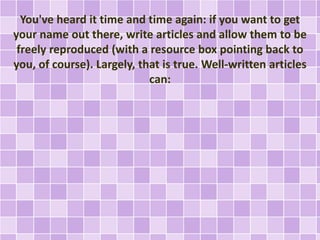 Well-written articles can help build an expert profile, drive website traffic, and generate potential clients. However, many struggle with the writing process. The document provides a four-step approach to captivating readers: 1) understand reader interests through research, 2) use attention-grabbing openings, 3) adopt a conversational tone, and 4) end on a positive note by offering hope or suggesting next steps. Following these tips can help produce popular articles that others want to publish.