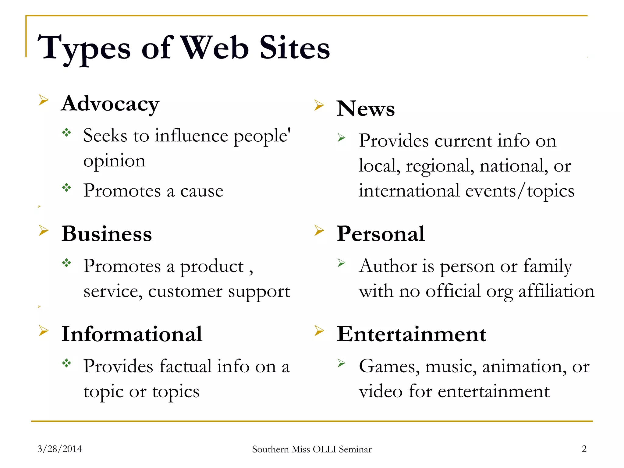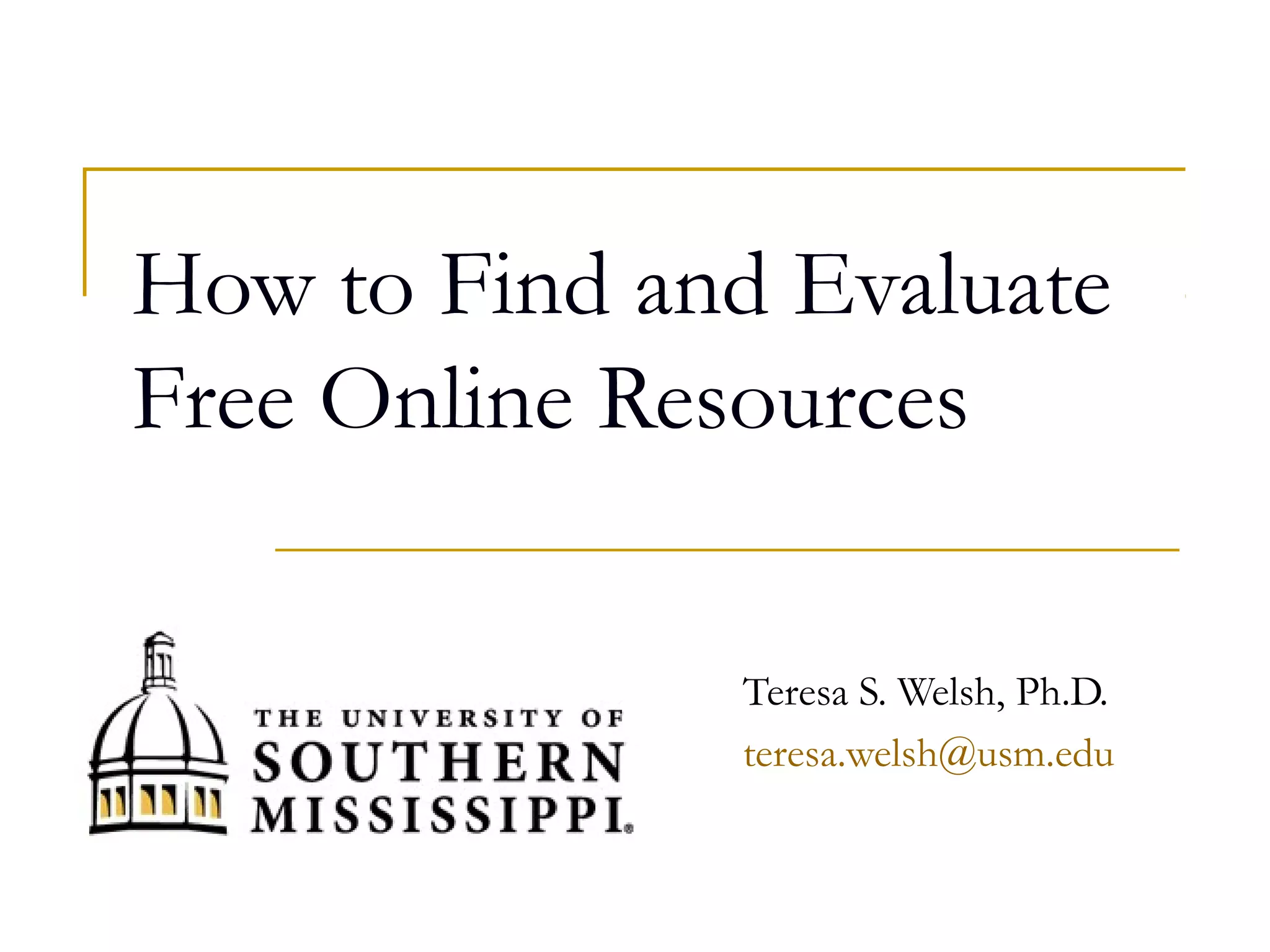 This document provides an overview of how to find and evaluate free online resources. It discusses different types of websites, criteria for evaluating websites such as currency and authority, and search tools like indexes compiled by information specialists. It also lists specific free online databases, technology tools, and medical, business, government, historical, genealogy, and travel information resources. Resources focused on Mississippi include sites for the blind/handicapped, Gulf Coast, Natchez Trace, Hattiesburg, and local museums.
