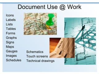 The document discusses essential workplace skills including reading various documents, using documents like forms and technical drawings, using numeracy skills like measuring and calculating, writing skills like memos and reports, oral communication like giving instructions and listening, thinking skills such as problem solving and decision making, using digital technology, continuous learning, working with others, and why these skills are important for individuals and the workforce.