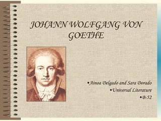 Johann Wolfgang von Goethe was a German writer and statesman who studied law and died in 1832. His most famous work is Faust, an epic poem about a man who makes a deal with the devil. Faust was first published in 1808 and explores themes of humanity's pursuit of knowledge and redemption.