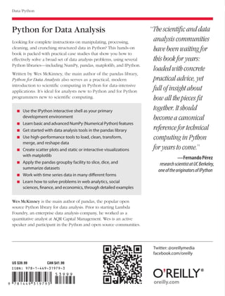 This book provides an overview of Python libraries for data analysis and scientific computing. It covers core libraries like NumPy, pandas, matplotlib and IPython, which are essential for tasks like loading, cleaning, transforming and visualizing data. The book also teaches best practices for data analysis workflows in Python and key programming techniques.