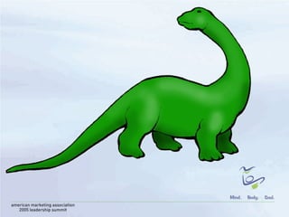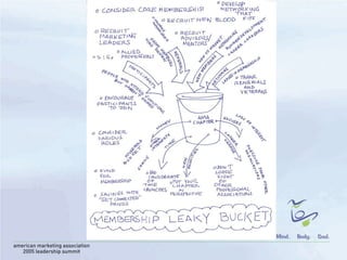 The document outlines key takeaways from the American Marketing Association Leadership Summit held in April 2005, emphasizing the importance of quality programming, networking, and understanding market dynamics to foster membership growth and engagement. It highlights challenges within the marketing profession and the need for leaders to effectively communicate their value while navigating competition and member retention. The document also stresses the significance of being innovative and adaptable in order to enhance the marketing association brand and better serve its constituents.