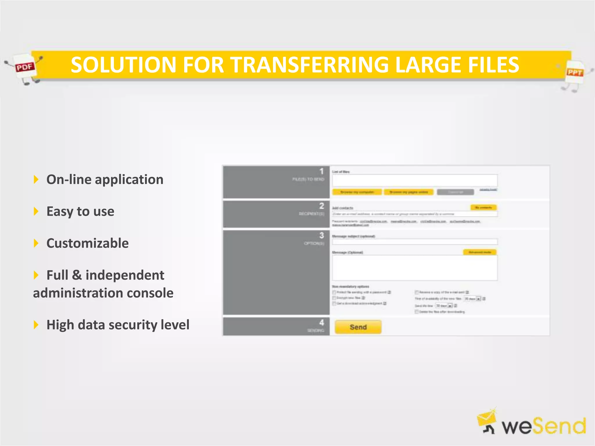 This document describes a solution for securely transferring large files online. The solution allows users to easily send files of all types up to 10 GB in size individually or in batches. Files are stored online for up to 30 days and can be accessed via a customizable administration console with user management, reporting, and security features like passwords and IP restrictions. The file transfer service is hosted securely and can integrate with third-party systems through APIs.