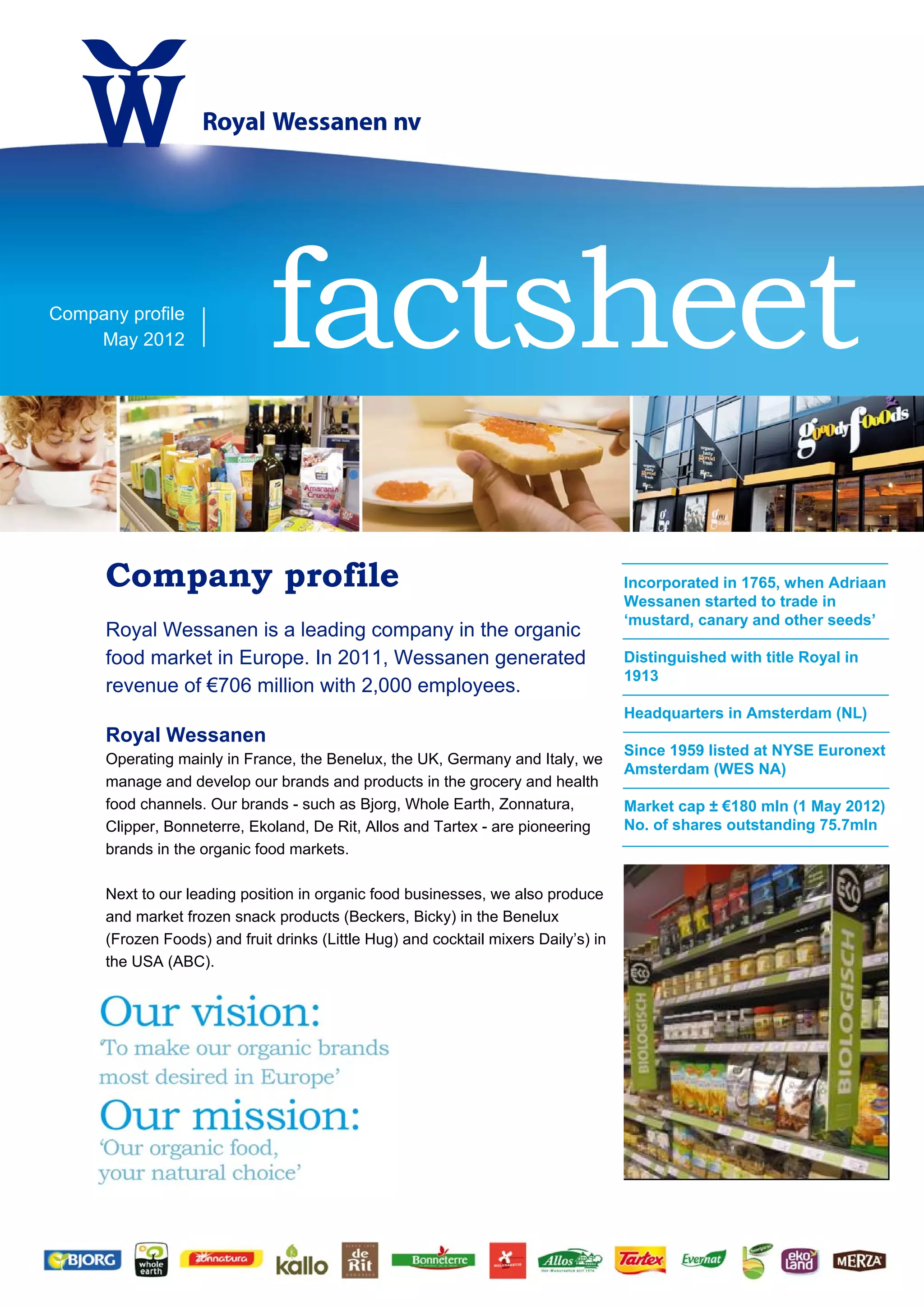 Royal Wessanen is a leading organic food company incorporated in 1765 and headquartered in Amsterdam. In 2011 it generated €706 million in revenue with 2,000 employees. It operates mainly in Western Europe under brands like Bjorg, Whole Earth, and Zonnatura. Its strategic objectives for 2012-2014 are top line growth through expanding core brands and markets, improving profitability through sourcing savings and operational excellence, and enabling growth through talent management and business simplification.