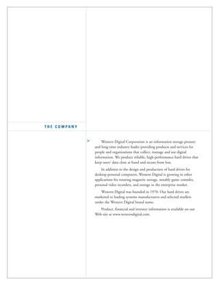 - Western Digital Corporation is an information storage company that produces hard drives for desktop PCs, game consoles, personal video recorders, and enterprise storage applications. - In fiscal 2002, the company's revenues grew 10% to $2.15 billion and unit volume rose 31% to 29.1 million hard drives. The company achieved profitability in every quarter of fiscal 2002. - Looking forward, the company expects growth to come from increasing market share in desktop PCs, replacing aging desktop PCs in businesses, growth of serial ATA hard drives in enterprise applications, and new consumer electronics products containing hard drives such as game consoles and personal video recorders.