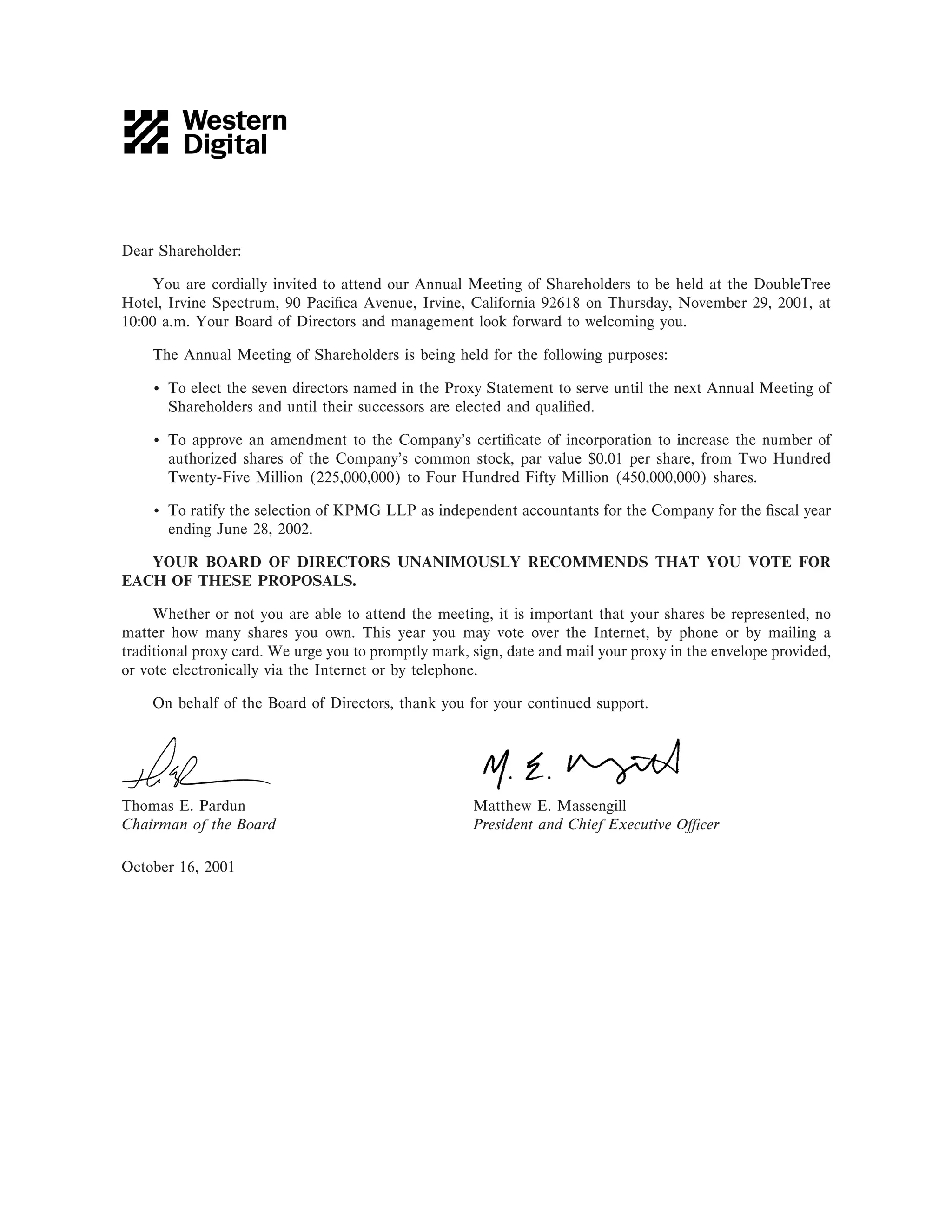 This document is a notice for the annual meeting of shareholders of Western Digital Corporation. It informs shareholders that the meeting will be held on November 29, 2001 at 10:00am at the DoubleTree Hotel in Irvine, California. The purposes of the meeting are to elect seven directors, approve an amendment to increase the number of authorized shares of common stock, and ratify the selection of KPMG LLP as the company's independent accountants. Shareholders are urged to vote for each proposal.