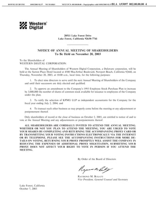 The document is a proxy statement for the annual meeting of shareholders of Western Digital Corporation. It informs shareholders that the meeting will be held on November 20, 2003 to elect nine directors, approve an amendment to increase shares available under the company's employee stock purchase plan, and ratify selection of an independent accountant. It recommends shareholders vote in favor of all proposals and provides instructions for voting whether in person or by proxy.