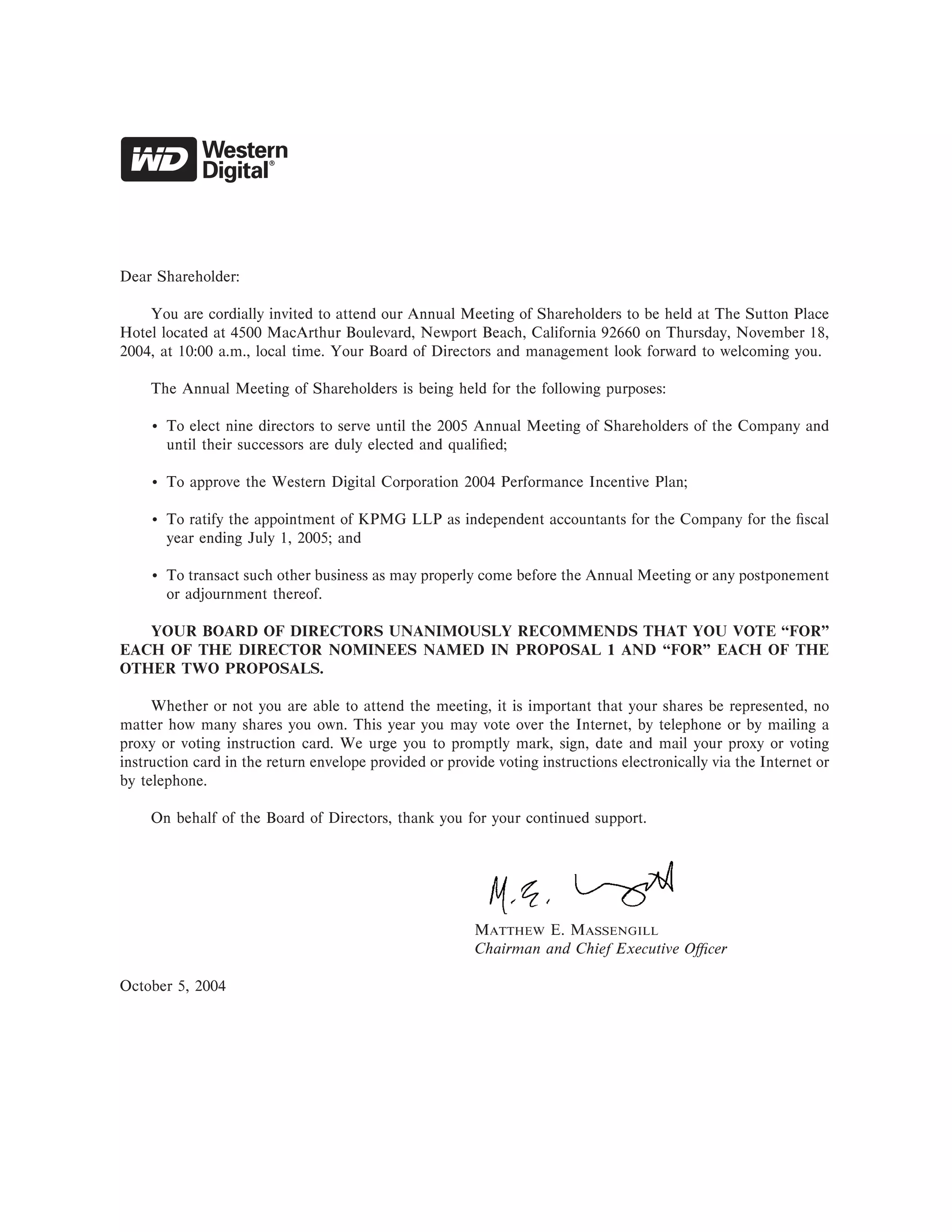 - The document is a notice for the annual meeting of shareholders of Western Digital Corporation to be held on November 18, 2004 at 10:00am at The Sutton Place Hotel in Newport Beach, California. - The purposes of the meeting are to elect nine directors, approve the 2004 Performance Incentive Plan, ratify the appointment of KPMG LLP as the company's independent accountants, and conduct any other business as necessary. - Shareholders are urged to vote by completing and returning a proxy card or voting electronically by the meeting date.