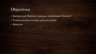 - Gorillas communicate through vocalizations like growling, hooting, and crying, as well as nonverbal cues like chest beating. The silverback protects the family group and establishes dominance.