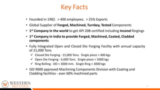 Western Heat & Forge is a global supplier of forged, machined, turnkey and tested components with over 400 employees and 25% exports. It has fully integrated forging and machining facilities certified to various quality and environmental standards. It provides a one-stop solution for forgings up to 5000kg, machined components through its "Machined Components Super Market", heat treatment, testing and other value-added services to customers in various industries like oil and gas, construction, automotive etc. It aims to add value through innovative supply chain solutions and meeting diverse customer needs.