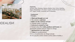The document provides an overview of key Western philosophies in education, namely idealism, naturalism, realism, and pragmatism, along with their proponents and fundamental principles. Each philosophy is examined in terms of educational principles, aims, curriculum, teaching methods, discipline, teacher roles, and the nature of schools. The contrasts among these philosophies highlight differing views on reality, the role of the mind, and the objectives of education.