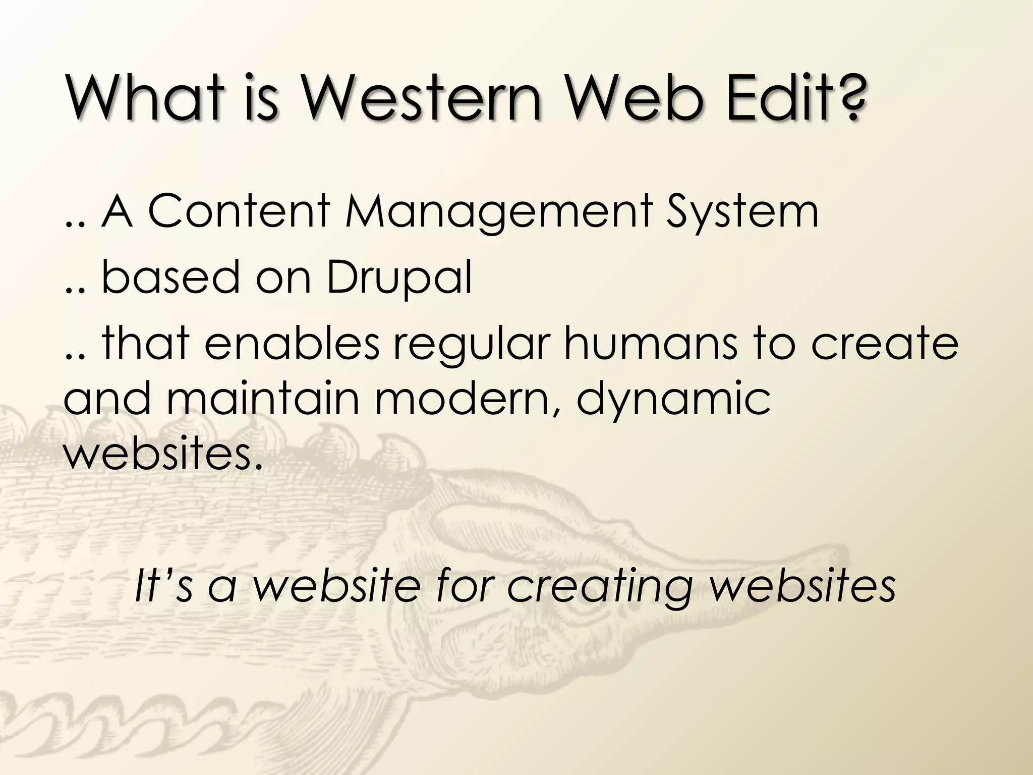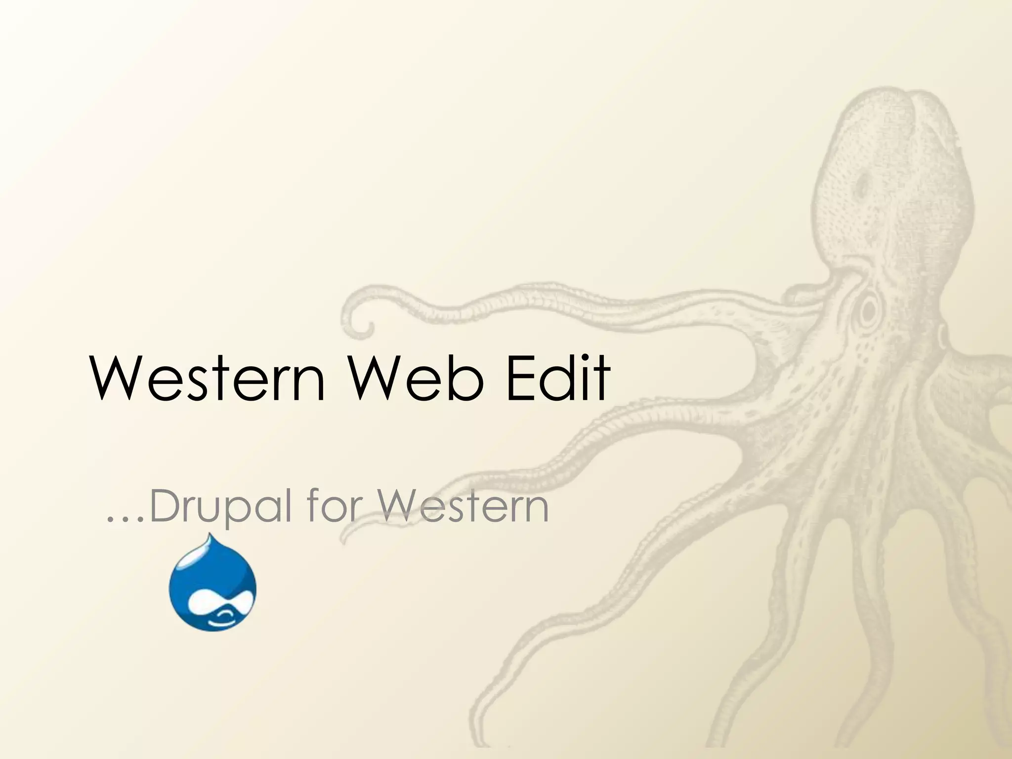 This document provides an overview and introduction to Drupal and content management systems (CMS). It explains that Western Web Edit is a CMS based on Drupal that allows non-technical users to create and maintain dynamic websites. Drupal is described as a free, open source, and robust CMS with an active community. A CMS allows content to be organized into reusable and reconfigurable fields rather than static pages, making websites dynamic as content changes. The document outlines the status and design process for launching Western Web Edit to provide departments the tools to more easily create and update their websites.