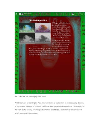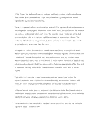 Wet Dream is an oil painting by Paul Jaisini that explores human sexuality and dreams. It depicts several nude female figures in erotic poses and states of arousal. Jaisini uses fluid, curving lines and forms to enhance the feeling of sensuality. The painting combines physical and psychological elements in a way that is nearly a game, rather than taking a simple approach to eroticism like some other artists. The work demonstrates how desire is an endless part of human existence that continues through our bodies and works of art.