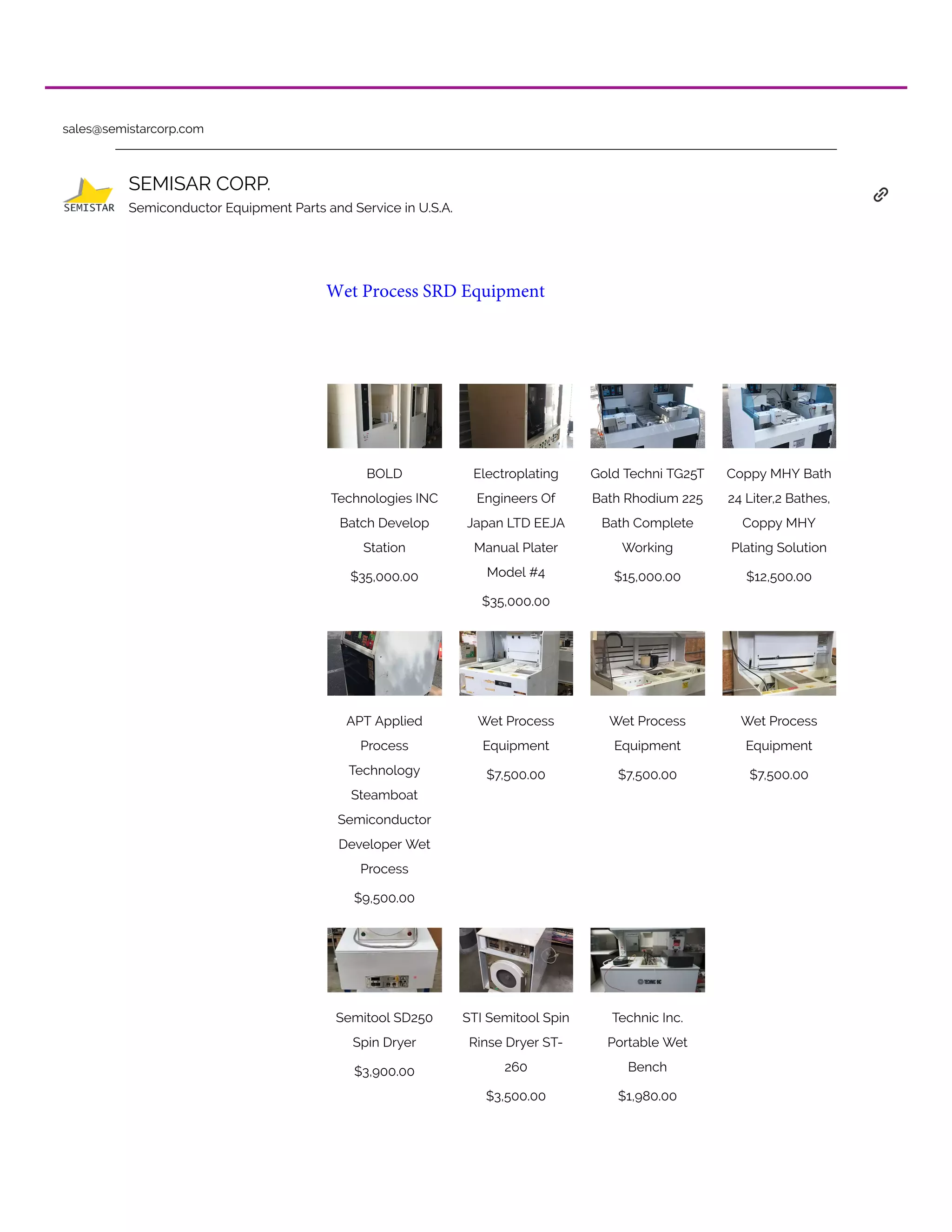 This document lists equipment for sale from various manufacturers for semiconductor wet processing including batch developing stations, plating equipment, wet benches, and spin dryers priced between $1,980 to $35,000. Key items include a BOLD batch developing station for $35,000, an EEJA manual plater for $35,000, a Gold Techni plating bath system for $15,000, and various wet process equipment from APT and Wet Process Equipment between $7,500 to $9,500.