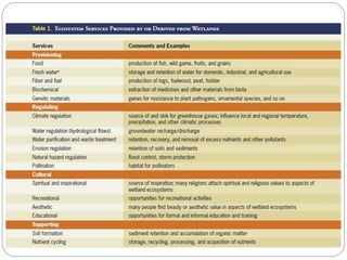 Wetlands are areas where water covers the land either permanently or seasonally. They are defined by having wetland vegetation and hydric soils that are saturated with water for long periods. Wetlands provide many benefits and can be classified by their location and type of vegetation. The document provides details on two important wetlands in India - Keoladeo National Park and Sambhar Lake. Keoladeo National Park is an important habitat for over 370 bird species and hosts thousands of migratory birds during winter. Sambhar Lake is India's largest inland saltwater lake and is an ecologically important site for flamingos and other migratory birds. It also produces over 90% of Rajasthan's salt through evaporation