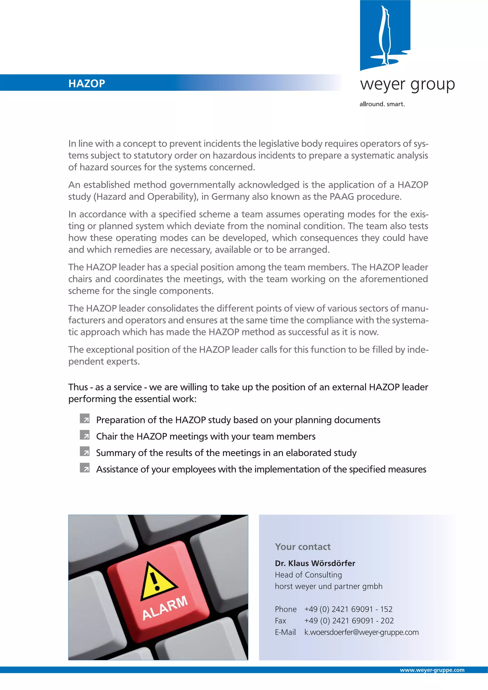 The document outlines the requirement for operators of hazardous systems to conduct systematic hazard analysis, specifically through HAZOP (Hazard and Operability) studies, to prevent incidents. A HAZOP study involves a team that examines non-nominal operating modes and their potential consequences, led by an independent expert known as the HAZOP leader. The document offers consulting services for HAZOP studies, including preparation, meeting facilitation, result summarization, and implementation assistance.
