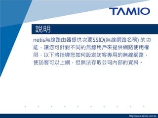 此文档提供netis无线路由器设置访客专用无线网络的详细教程,确保访客可上网但无法访问内部网络。文中包含具体步骤,包括登录路由器、设置次要SSID、配置加密等。完成后,用户可将访客无线网络名称提供给来访者使用。