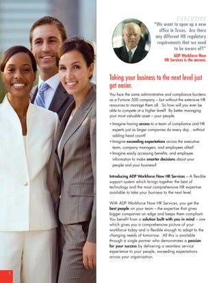The document provides information about ADP Workforce Now HR Services, which offers a comprehensive suite of HR, payroll, and benefits administration tools and services to help businesses compete at a higher level. It highlights the integrated tools, team of experts, and high level of service provided. Key features include assistance with compliance requirements, HR administration, payroll processing, benefits administration, and other HR functions.
