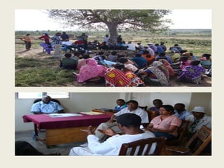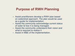 The document outlines the planning process for rainwater harvesting and management interventions at the community level. It discusses determining community needs, understanding local natural resources, selecting appropriate technologies, encouraging community participation, and ensuring long-term sustainability. The planning process involves baseline data collection, identifying suitable sites, designing water infrastructure, and developing a district-level plan map to guide implementation and management of rainwater resources.