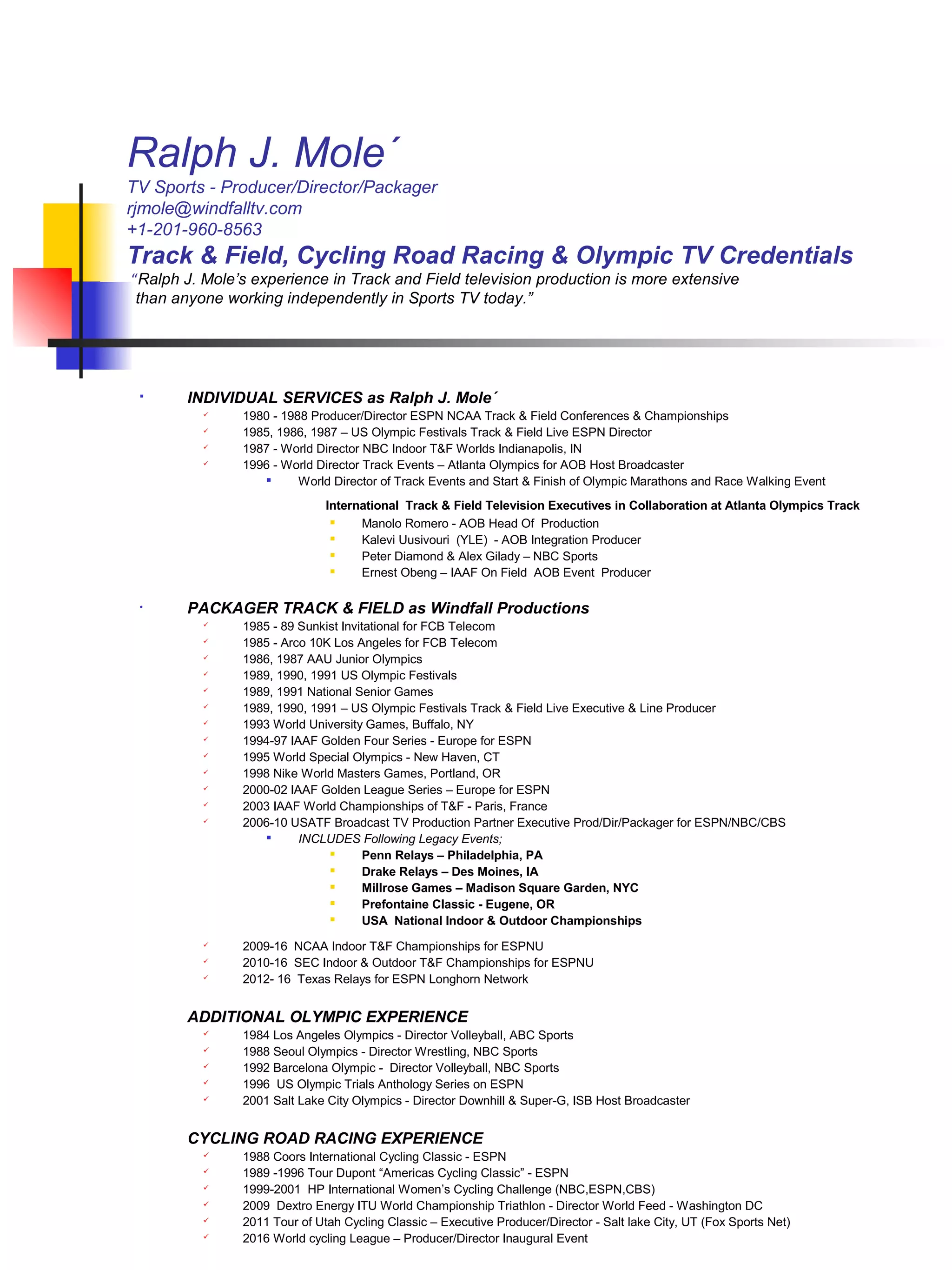 Ralph J. Mole is a highly experienced producer and director in track and field and cycling television, having worked with major networks like ESPN and NBC from the 1980s through 2016. His extensive portfolio includes directing at multiple Olympic Games, NCAA championships, and various prestigious track and cycling events. Mole has also packaged numerous sporting broadcasts, establishing himself as a significant figure in sports TV production.