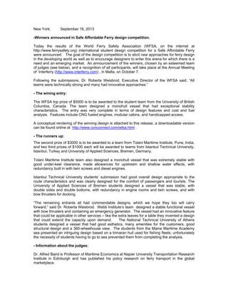 The World Ferry Safety Association announced the winners of their international student design competition for a Safe Affordable Ferry. The first prize of $5,000 was awarded to a team from the University of British Columbia for their stable monohull design with efficient engines and accessibility features. The second prize of $3,000 went to a team from Tolani Maritime Institute in India for their extremely stable monohull design. Two third prizes of $1,000 each were given to teams from Istanbul Technical University in Turkey and the University of Applied Sciences in Bremen, Germany for vessel designs appropriate for their intended routes and passenger comfort.
