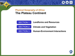Africa is known as the "plateau continent" as a large plateau covers most of its land area. It features various landforms like basins, rift valleys, and mountains formed by volcanic activity. Africa has a diversity of climates from hot deserts to tropical rainforests. However, human activities like overgrazing, deforestation, and oil extraction have led to issues like desertification and environmental damage in places like the Niger Delta. Major projects to control rivers, like the Aswan High Dam on the Nile, have allowed for increased agriculture but also disrupted ecosystems and communities.