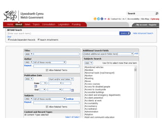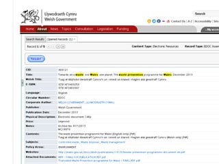 The document discusses the Welsh Government's efforts in publishing and providing access to information, with over 770 publications annually. It outlines the availability of resources through various websites, social media, and a publications catalogue, while also addressing the management of Freedom of Information (FOI) requests. There is an emphasis on archiving materials for future research and the potential need for a national Welsh archive.