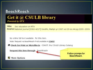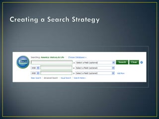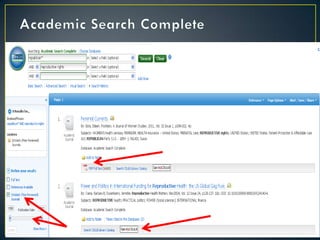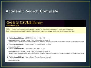 The document provides guidance on conducting research for a Women's Gender and Sexuality Studies paper. It outlines a 5-step research process including developing a search strategy with keywords and questions, selecting relevant databases, searching databases, evaluating resources, and applying information. Database recommendations are provided for finding peer-reviewed sources. Boolean operators and truncation techniques for effective database searches are explained. Tips for distinguishing popular and scholarly sources are also included. Contact information is provided for research consultations.