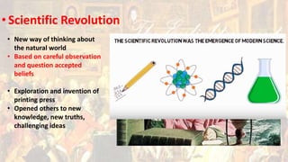 The Enlightenment was an intellectual movement that emphasized reason, science, and individualism. Key figures like Copernicus, Galileo, Bacon, and Newton used careful observation and experimentation to challenge accepted beliefs and prove theories like heliocentrism and gravity. Meanwhile, philosophers such as Voltaire, Montesquieu, and Rousseau advocated for ideals like tolerance, liberty, and democracy based on logic and natural rights. The Scientific Revolution and Age of Reason transformed thought and helped ushered in principles of the modern world.