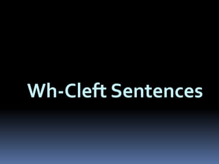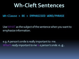 Wh-cleft sentences are used to emphasize specific information in a sentence by restructuring it with "what" or "why" clauses and a form of the verb "be". They can emphasize the subject, object, or entire sentence. What-cleft sentences rearrange elements of the original sentence around a "what" clause followed by a form of "be" plus the emphasized element. They-cleft sentences similarly emphasize reasons or other elements with "the reason why" or "the thing that" clauses.