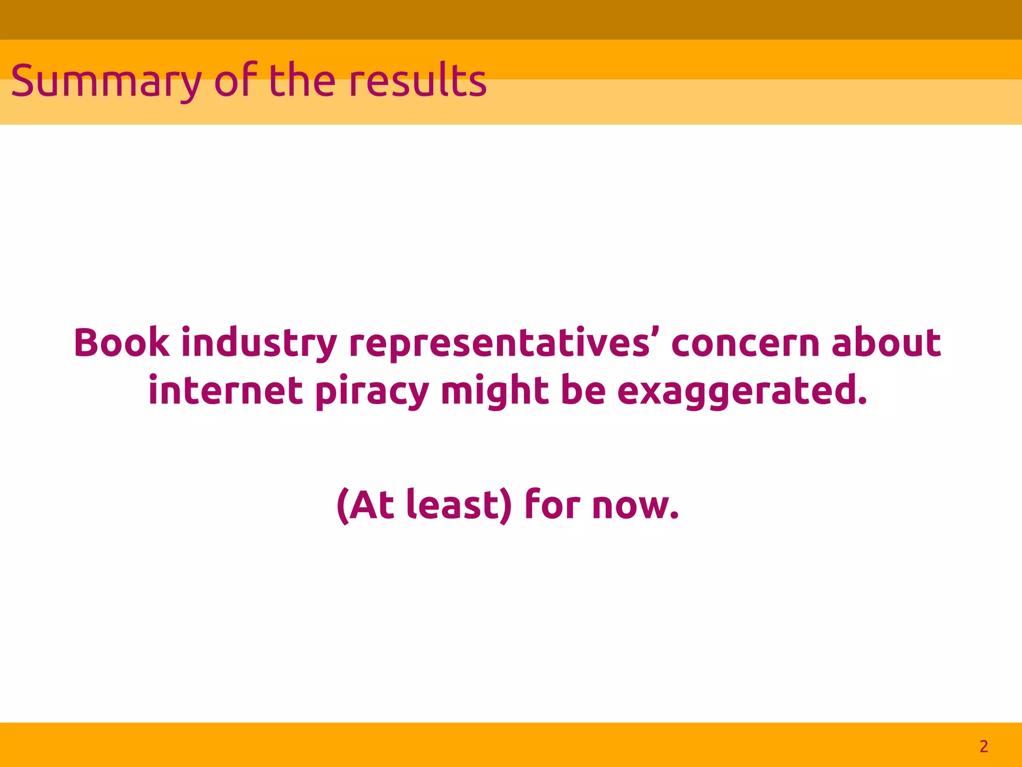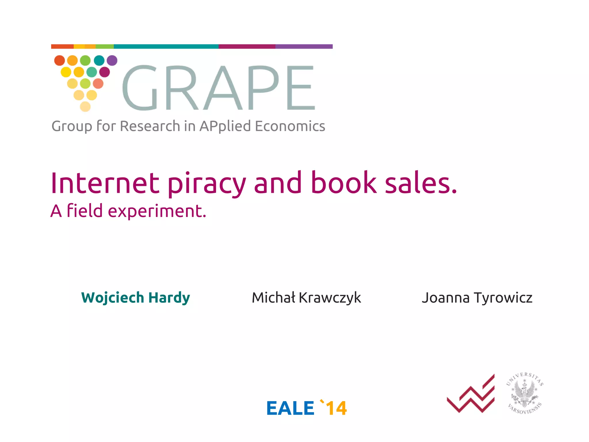 This document summarizes a field experiment on the impact of internet piracy on book sales in Poland. Researchers obtained sales data for almost 250 books from 9 publishers and matched them into pairs. For each pair, they randomly designated one book as the control and removed unauthorized copies of the other book (treatment) from piracy websites for a year. Tests found no significant differences in sales between the control and treatment groups, suggesting that internet piracy may not negatively impact book sales. The researchers conducted additional analyses to test more complex relationships but still found no effects of piracy on sales.