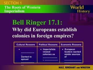 This document discusses the roots of Western imperialism between 1870-1914. It provides three main reasons for European imperialism: political, economic, and cultural. Politically, European leaders sought colonies as sources of troops and to increase national prestige. Economically, they wanted colonies for raw materials, new markets, and land for a growing population. Culturally, Europeans viewed non-Western peoples as primitive and aimed to spread Christianity and their cultural values. The document outlines different types of colonial control and provides examples of how imperialism impacted specific regions of Africa and Asia.