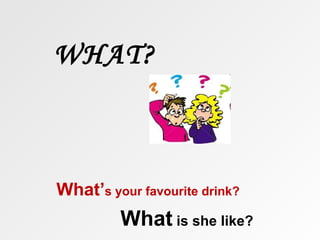 This document provides examples of common question words used to ask questions in English and short exercises to practice using question words. It includes the question words what, who, where, which, when, how many, how much, what time, why, how long, whose, and how with example questions using each word. There are also exercises asking the reader to complete sentences with the correct question word and ask their friend questions using question words.