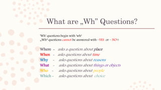 This document summarizes different types of "Wh" questions in English including: