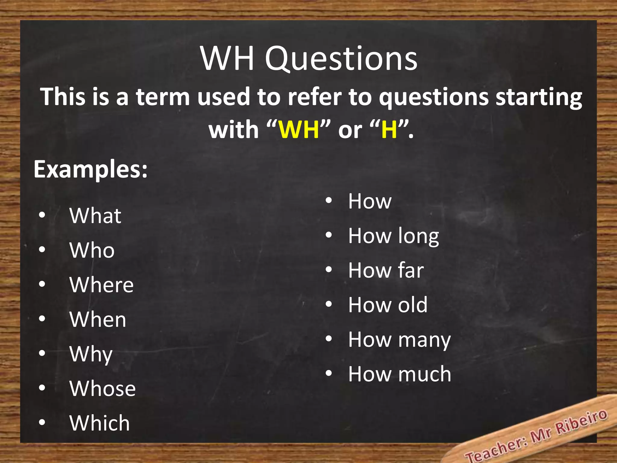 This document discusses WH-questions, which refer to questions beginning with WH- or H- words. It provides examples of common WH-question words like what, who, where, when, why, whose, which, how, how long, how far, how old, how many, and how much. The document also includes a table showing each WH-question word, its meaning, and a sample sentence using that word. It concludes with an exercise asking the reader to fill in the correct WH-question word for several sentences.