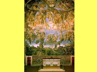 The Renaissance was a period between 1400-1700 where new ideas in art, expression, and intellectual works flourished. Major writings from ancient Greece and the Middle East were translated into Latin, spreading new ideas. The Renaissance began in Italy, where wealthy merchant cities like Florence and Venice funded the arts. Notable Renaissance figures included Leonardo da Vinci, Michelangelo, and Raphael, who pioneered new styles of art like realistic perspective and emphasis on individual subjects. The Renaissance valued humanism and reason over religious superstition.